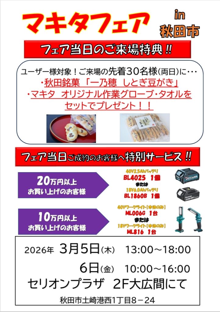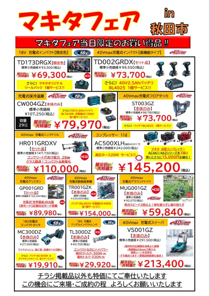 マキタフェア開催のお知らせ ホーム NEWS&TOPICS マキタフェア開催のお知らせ このたび「マキタフェア in 秋田市」を下記の通り開催いたします! 当日は最新のマキタ製品を特別価格にてご提供いたします!!ご来場特典やご成約特典も多数ご用意しておりますので、ぜひこの機会にご来場ください! 詳細は下記のチラシに記載しております。 また、チラシ掲載以外の商品も特別価格でご用意しております! ぜひご来場・ご成約を賜りますようお願い申し上げます。